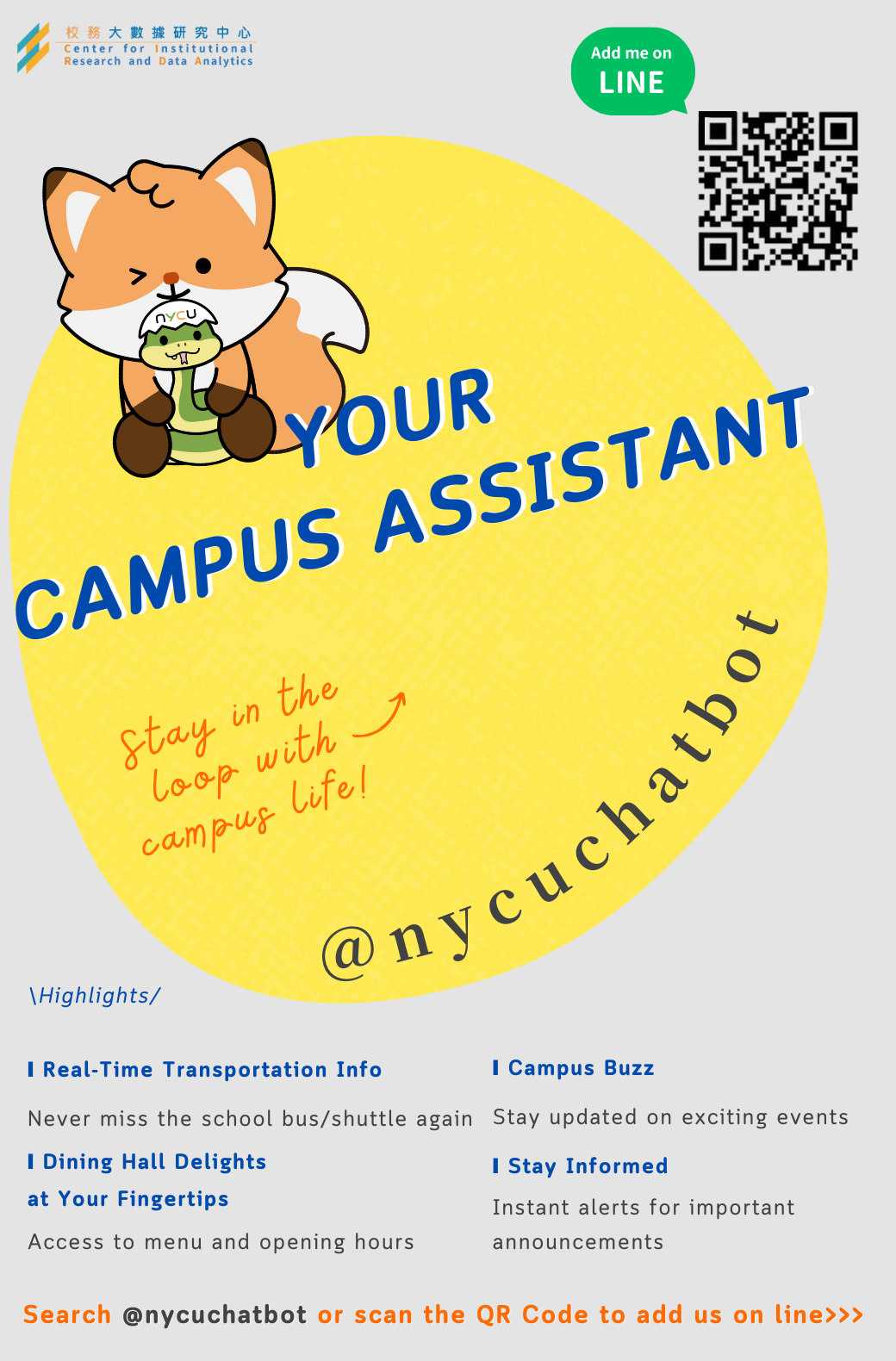 由校務大數據研究中心所開發的聊天機器人─國立陽明交通大學校園小幫手(簡稱校園小幫手),致力於為陽明交大校園中的日常大小事提供及推播資訊。在2023年9月,校園小幫手與LINE台灣進行官方合作,正式成為受認證之官方帳號@nycuchatbot。校園小幫手於2020年12月正式推出,歷經了多次改版,現已累積將近8,000位的使用者。