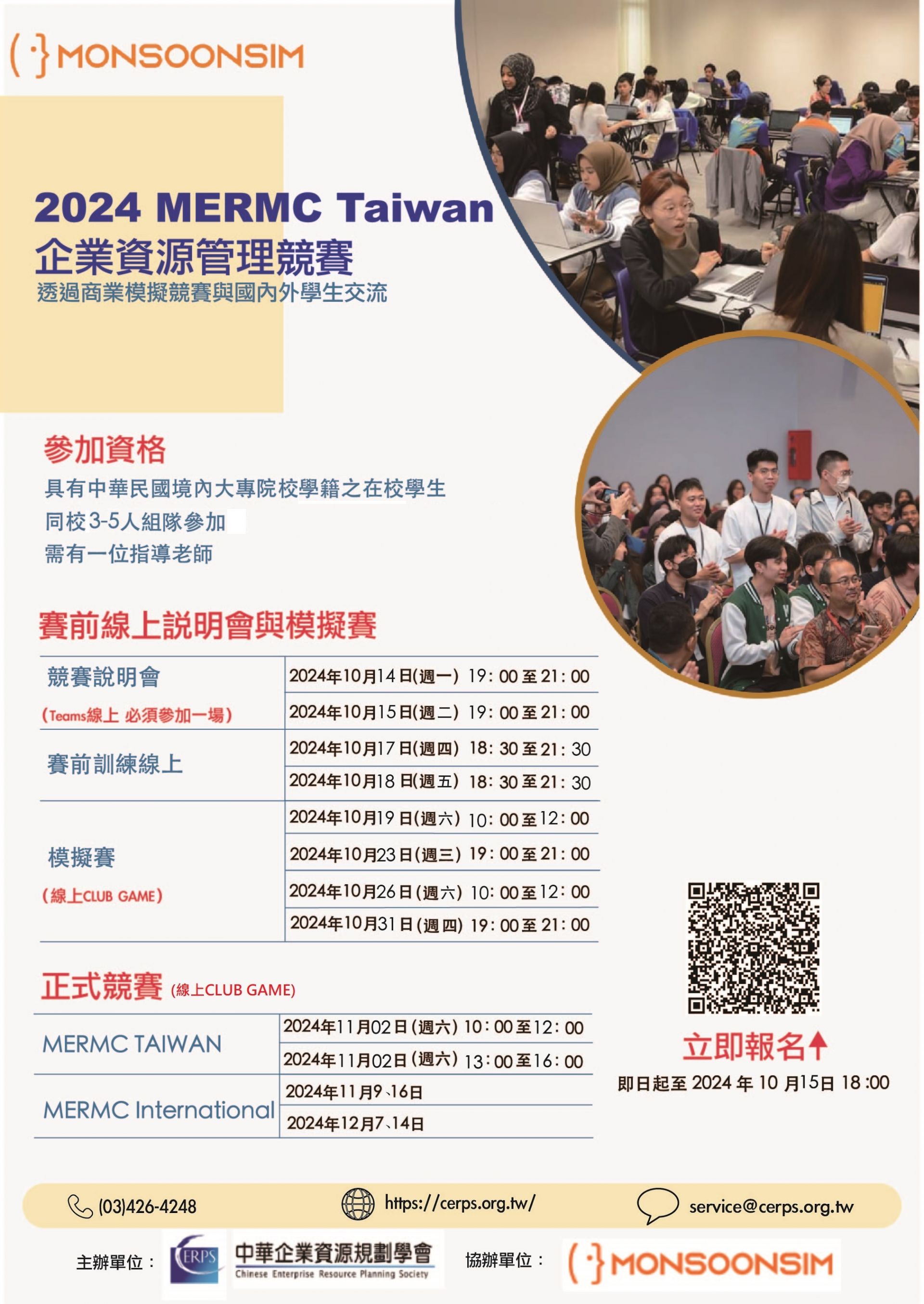MERMC(MonsoonSim Enterprise Resource Management Competition) 是由澳洲MonsoonSIM公司舉辦的年度國際競賽,MERMC Taiwan將選拔優勝隊伍代表我國參加,與世界各國的隊伍同場競技。學生以3-5名學生為一組的團隊將被要求合作經營虛擬公司(與財務、零售、B2B、市場行銷、電子商務、製造、人力資源、物流、研發等不同部門合作),以線上即時的方式模擬企業營運,相互競爭最高的業務KPI目標。