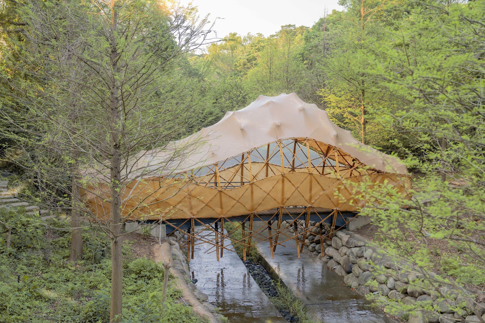 Designed by architect En-Kai Kuo from Forest-Wood Archi-Tect., the “Bridge Cocoon” employs the innovative “steam-bent bamboo” technique to craft its bamboo arch framework. The structure is adorned with natural elements such as tensile fabric and bamboo paper, enveloping the original steel pedestrian bridge with a cocoon-like exterior. Treated with advanced weather-resistant technology, the materials are waterproof, light-permeable, and textured with a drum-skin-like finish, turning the bridge into a poetic landmark on campus.