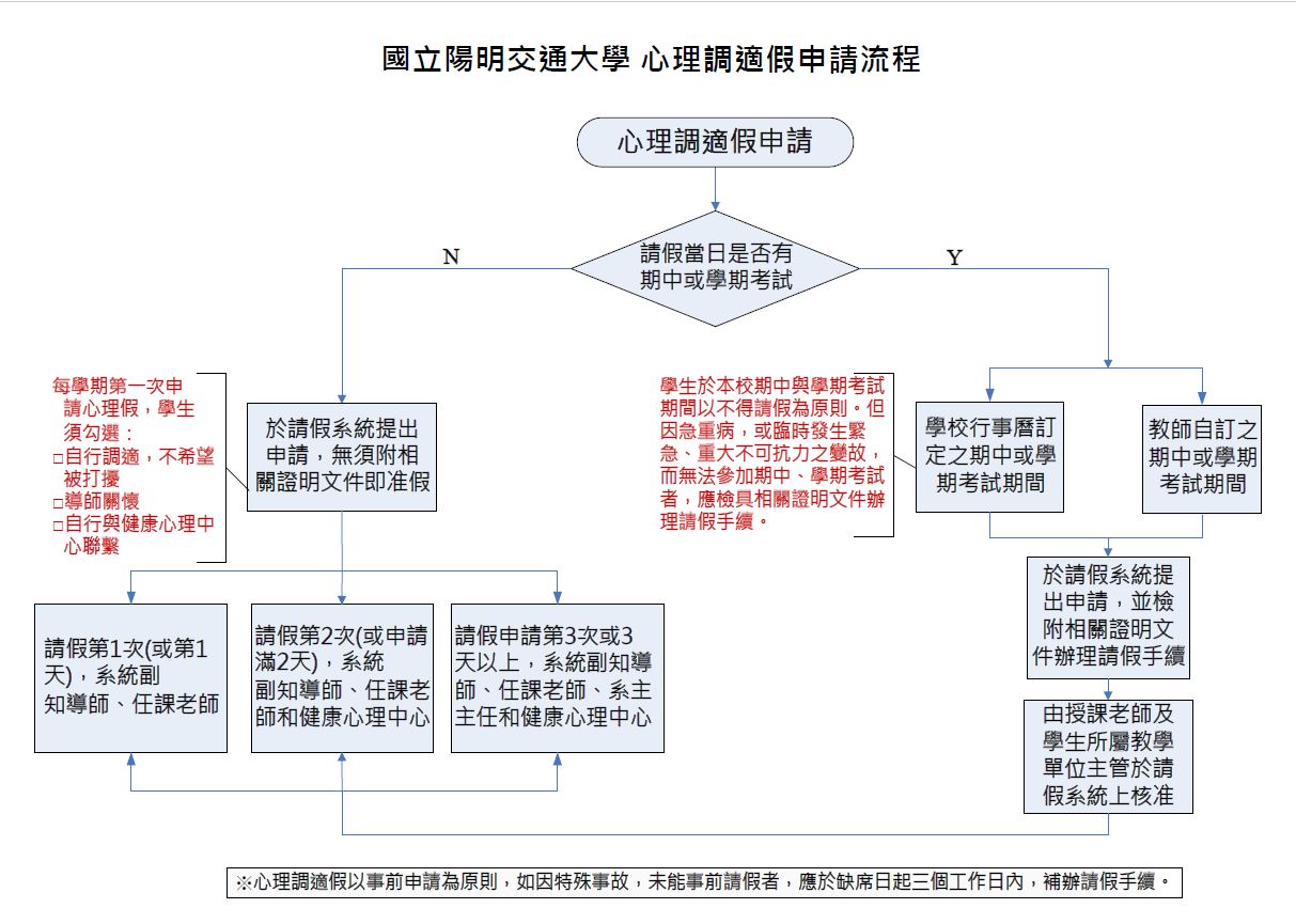 - 因生理期不適請假,每月以1日為限。心理調適假無次數限制,惟於請假系統提出申請後,系統會發信副知導師、任課老師或健康心理中心進行關懷。