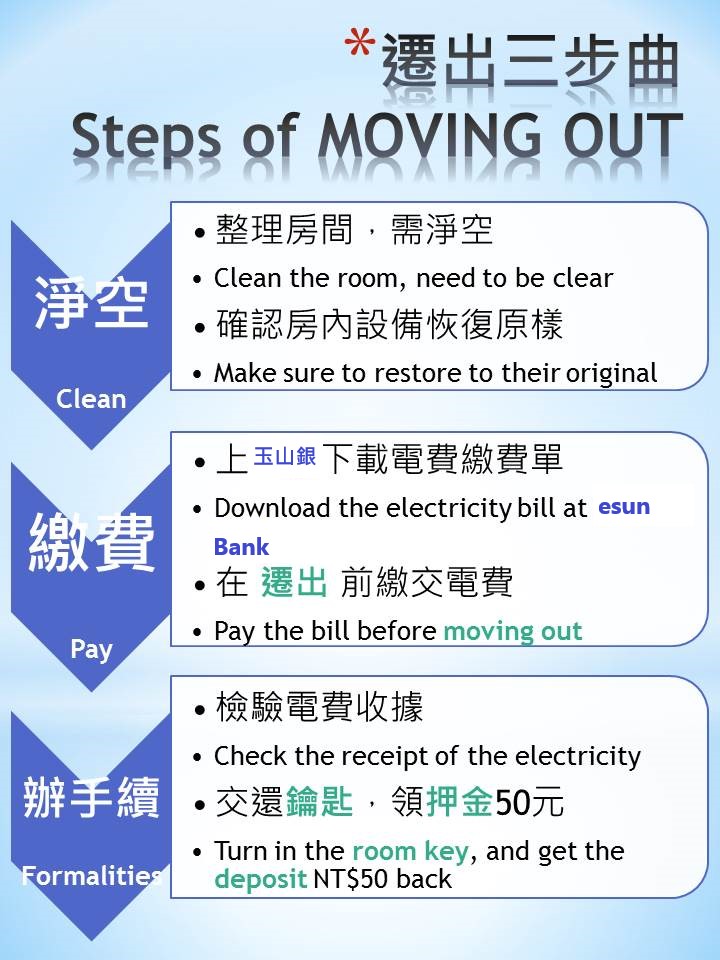 - 凡入住及搬離本校學生宿舍,皆須辦理遷入或遷出手續。