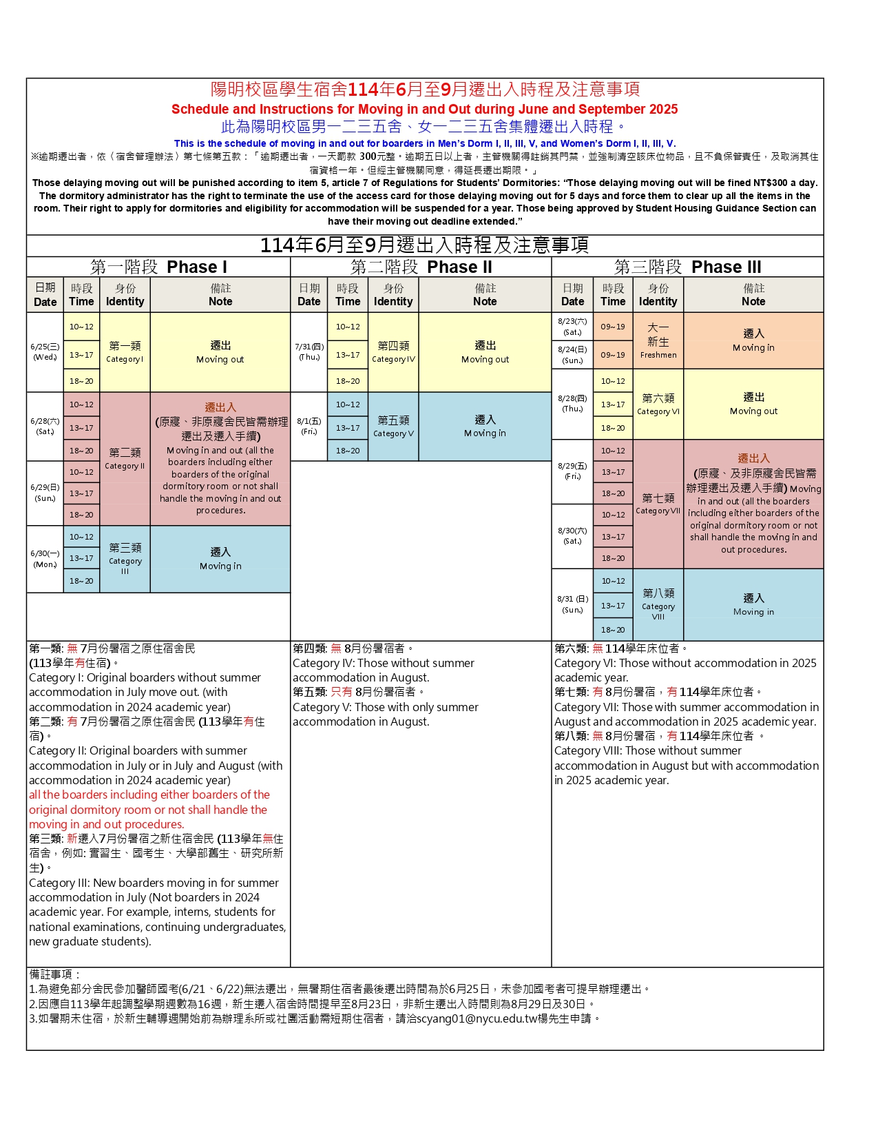 - 辦理遷入及遷出的時間為學期初及暑期/學期末,114年度暑期遷出入時間詳如上方表格。地點則請洽各舍住輔員室詢問或查詢本組網頁公告,暑期或學期結束後仍住原寢室者(保留原寢者)亦須辦理遷出入手續。