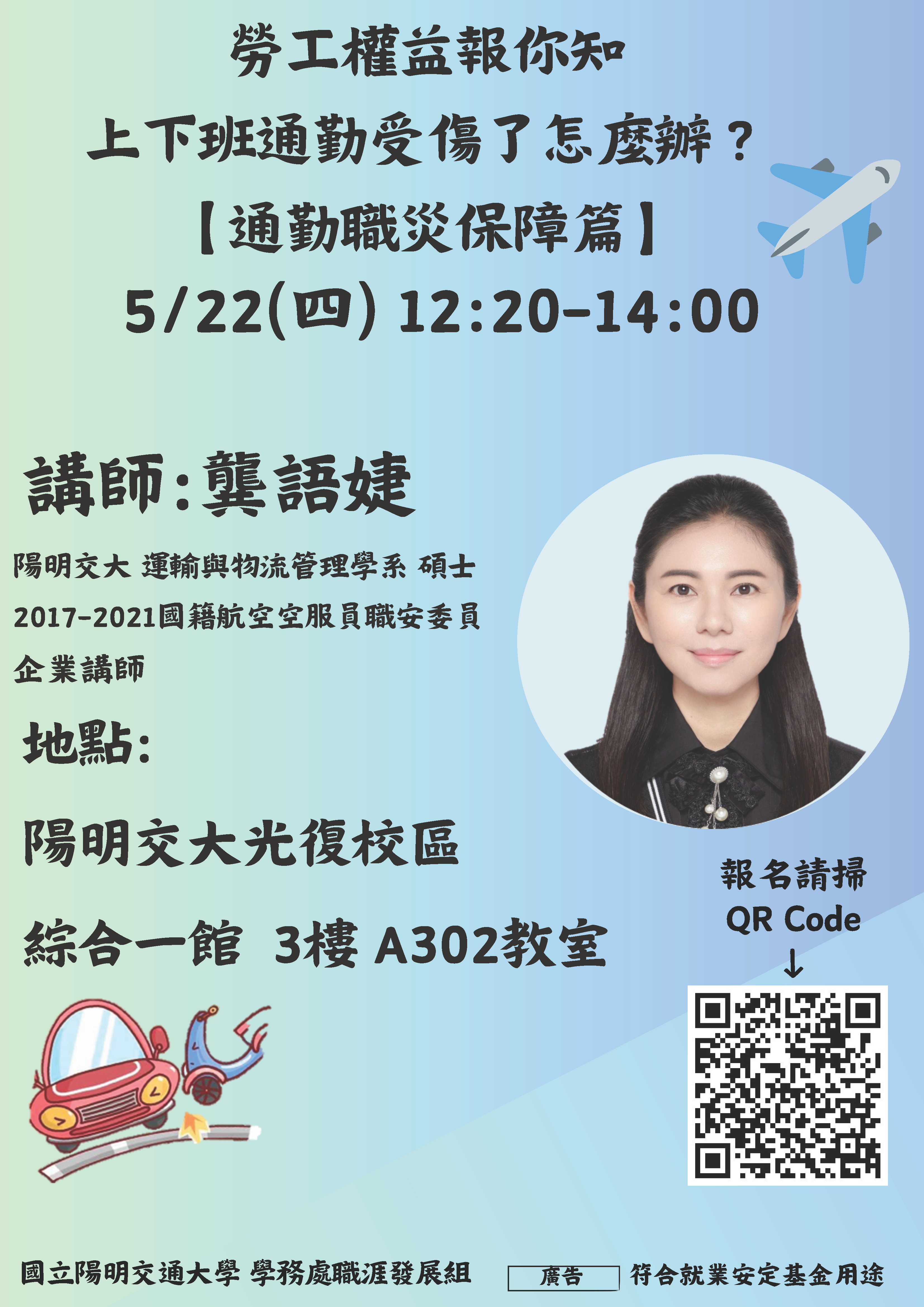 職涯講座-5/22(四) 勞工權益報你知,上下班通勤受傷了怎麼辦 ? 【通勤職災保障篇】(講師加碼提供QA禮!)