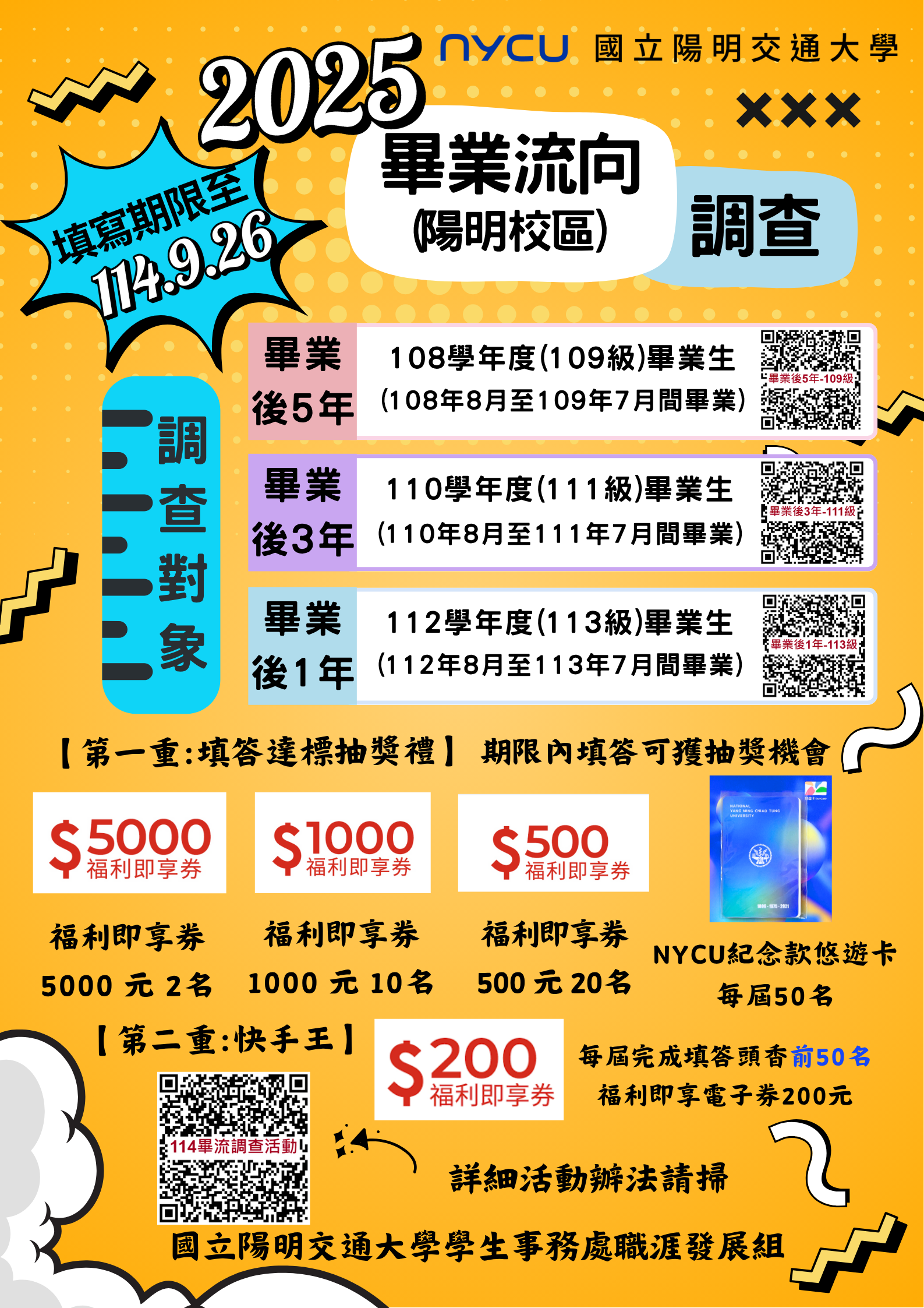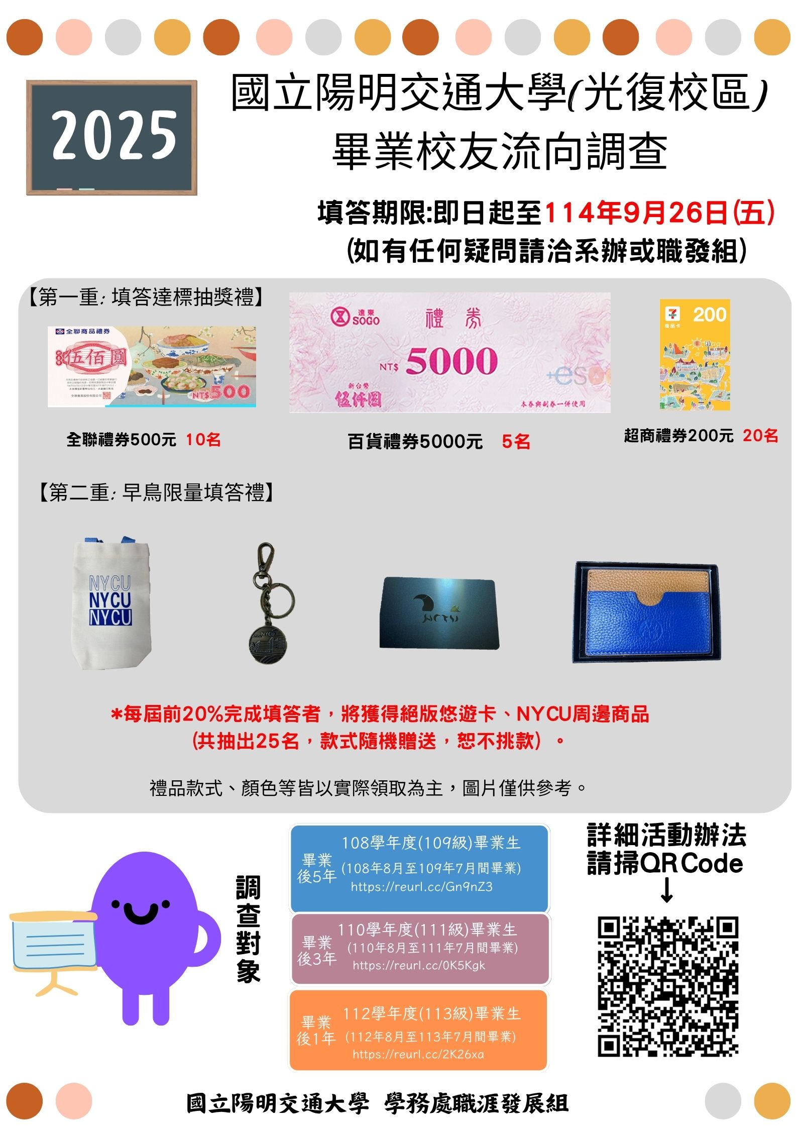 為了瞭解陽明交通大學校友畢業後一年、三年及五年的就業及進修現況,母校誠摯地邀請您協助填答「畢業後校友現況流向」調查問卷。
