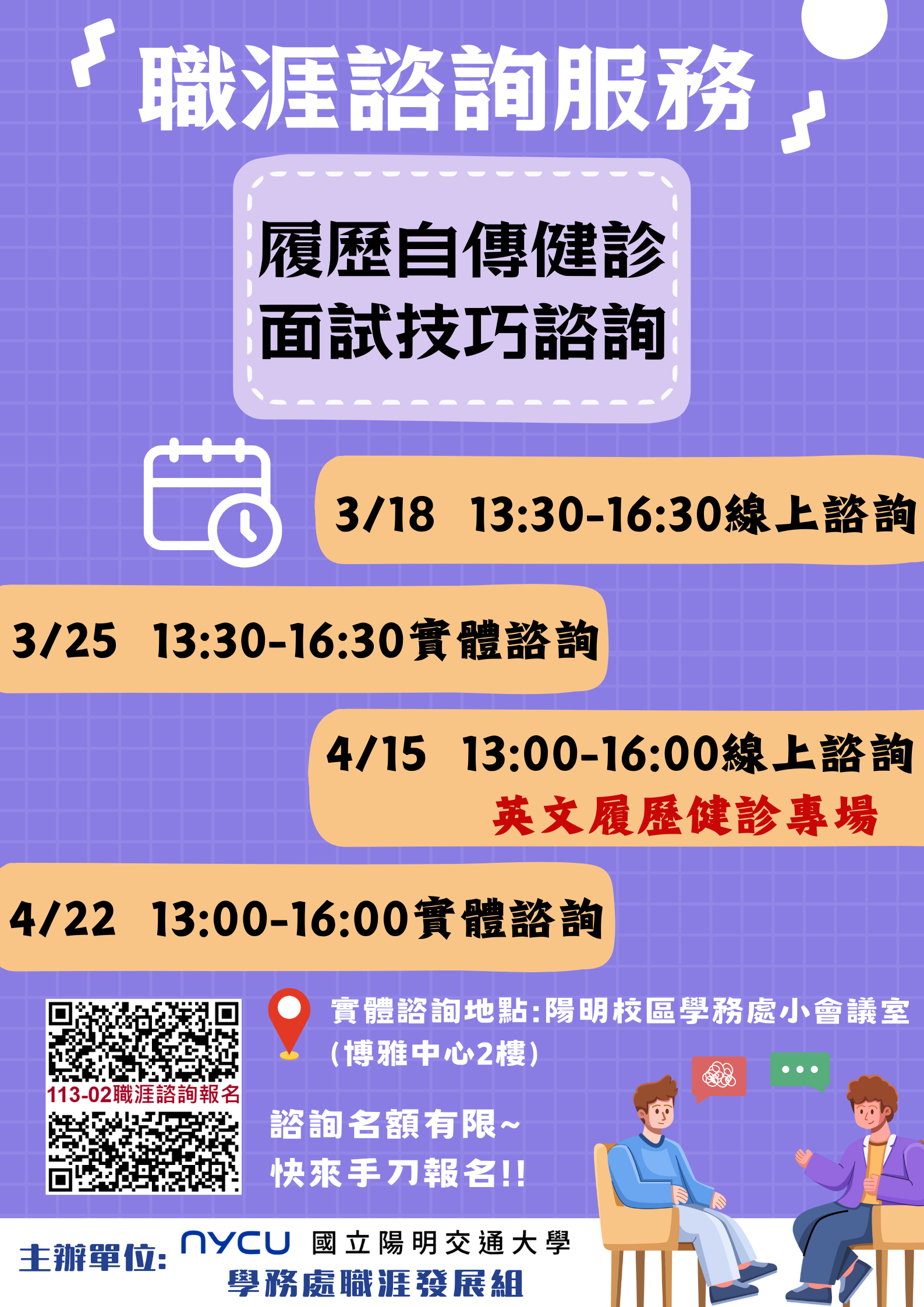 3.不限校區,皆可報名參加,惟請注意【實體諮詢】地點位於陽明校區喔!!