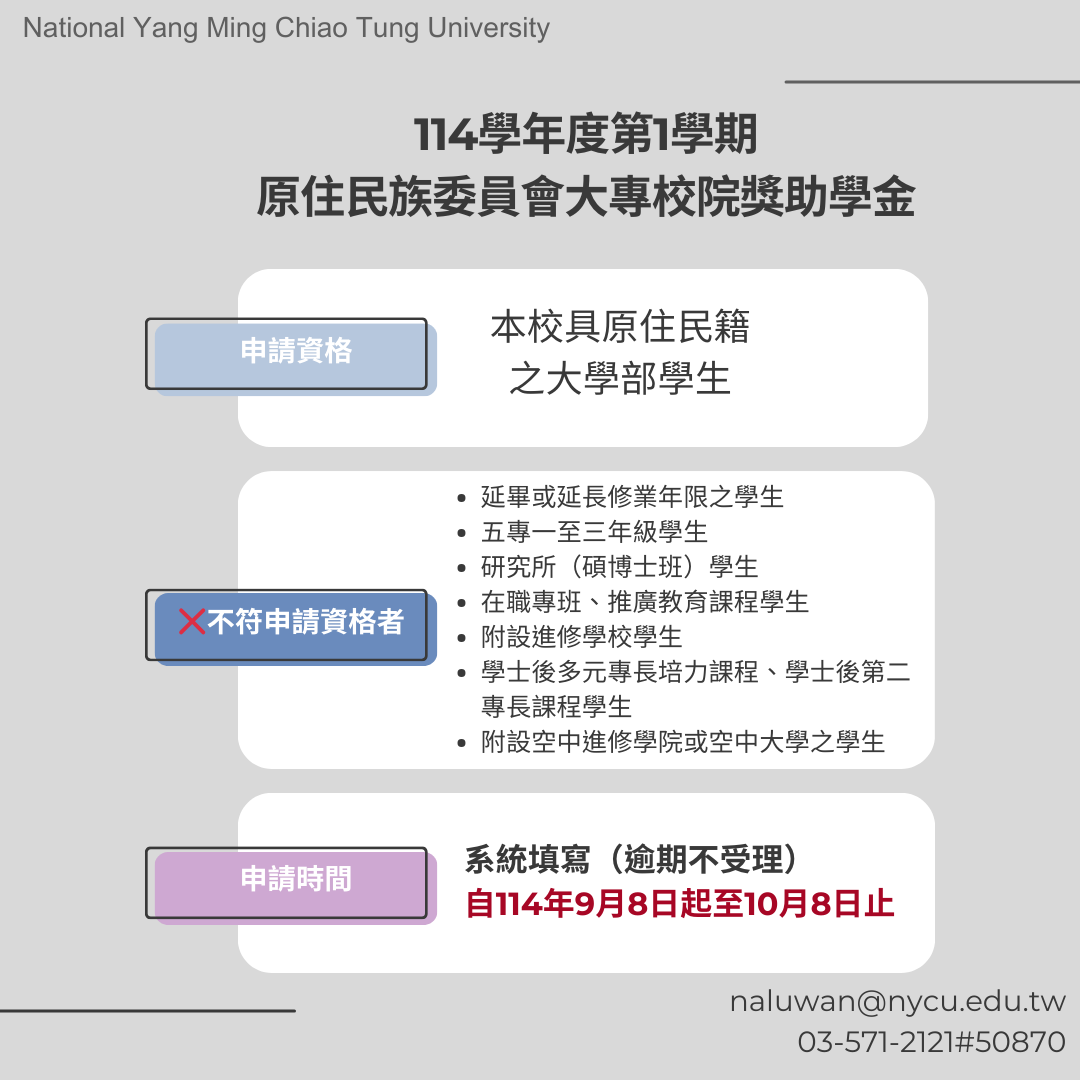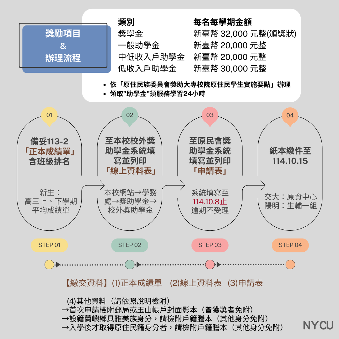 【獎助學金】114學年度第1學期原住民族委員會大專校院獎助學金,114/9/8(一)起線上開放申請至114/10/8(三)止