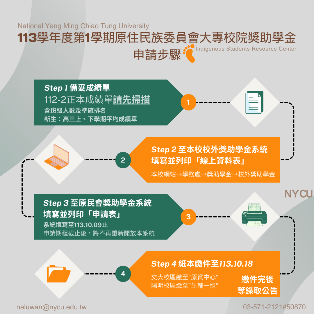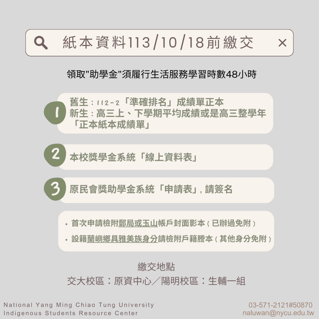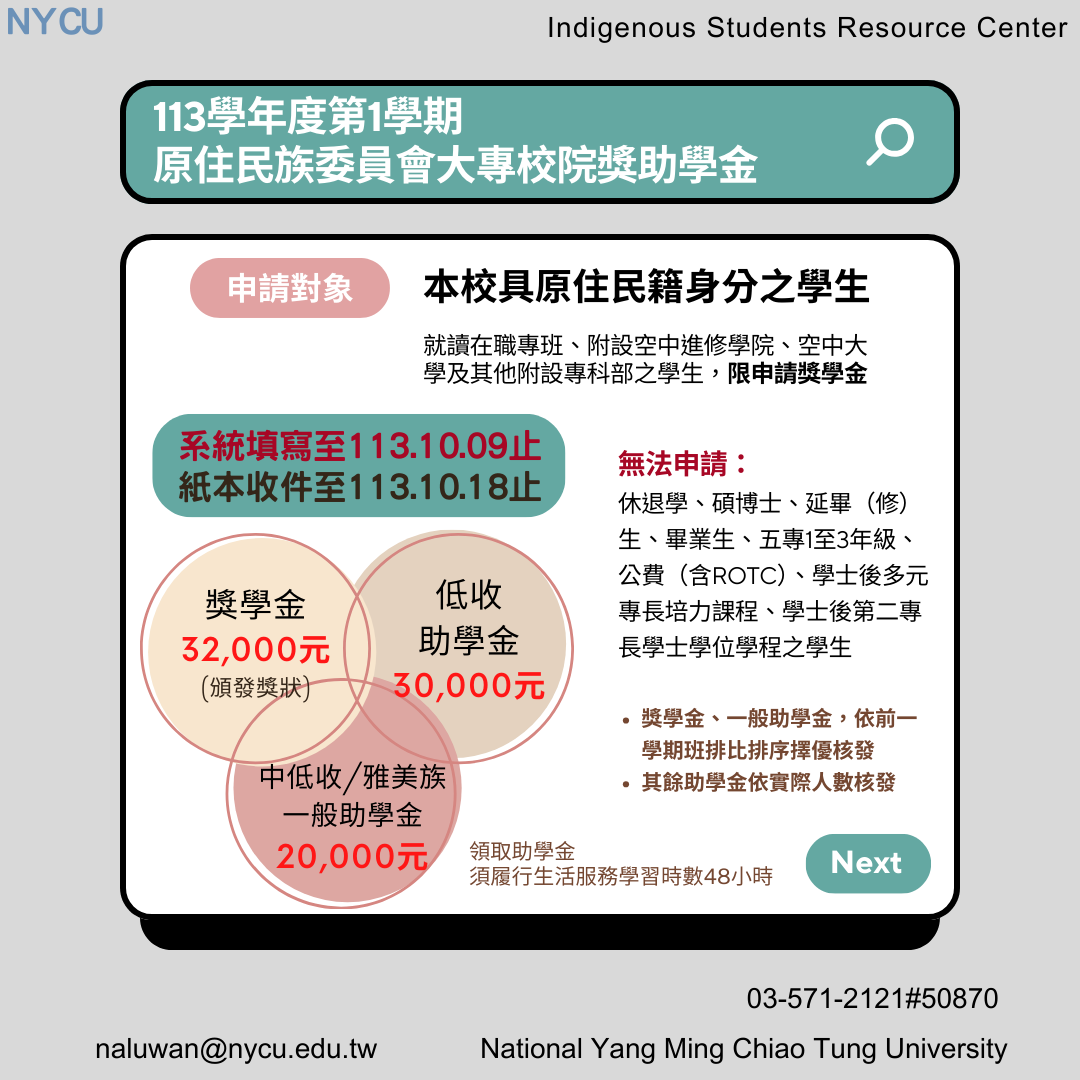 【獎助學金】113學年度第1學期原住民族委員會大專校院獎助學金,113/9/9(一)起線上開放申請至113/10/9(三)止。