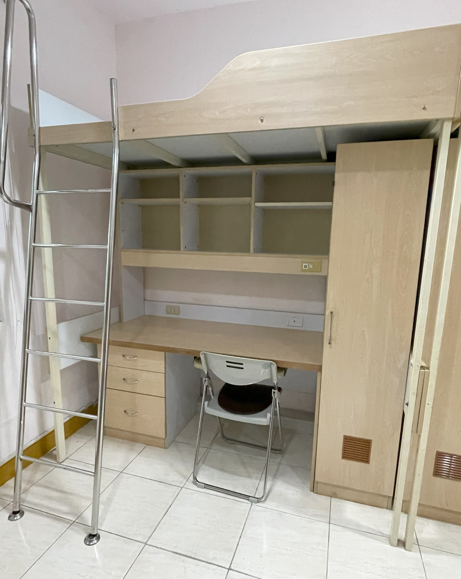 寢室設備:床架(須自備床墊,尺寸為:190 CM*96 CM )、書桌椅、衣櫃、冷氣