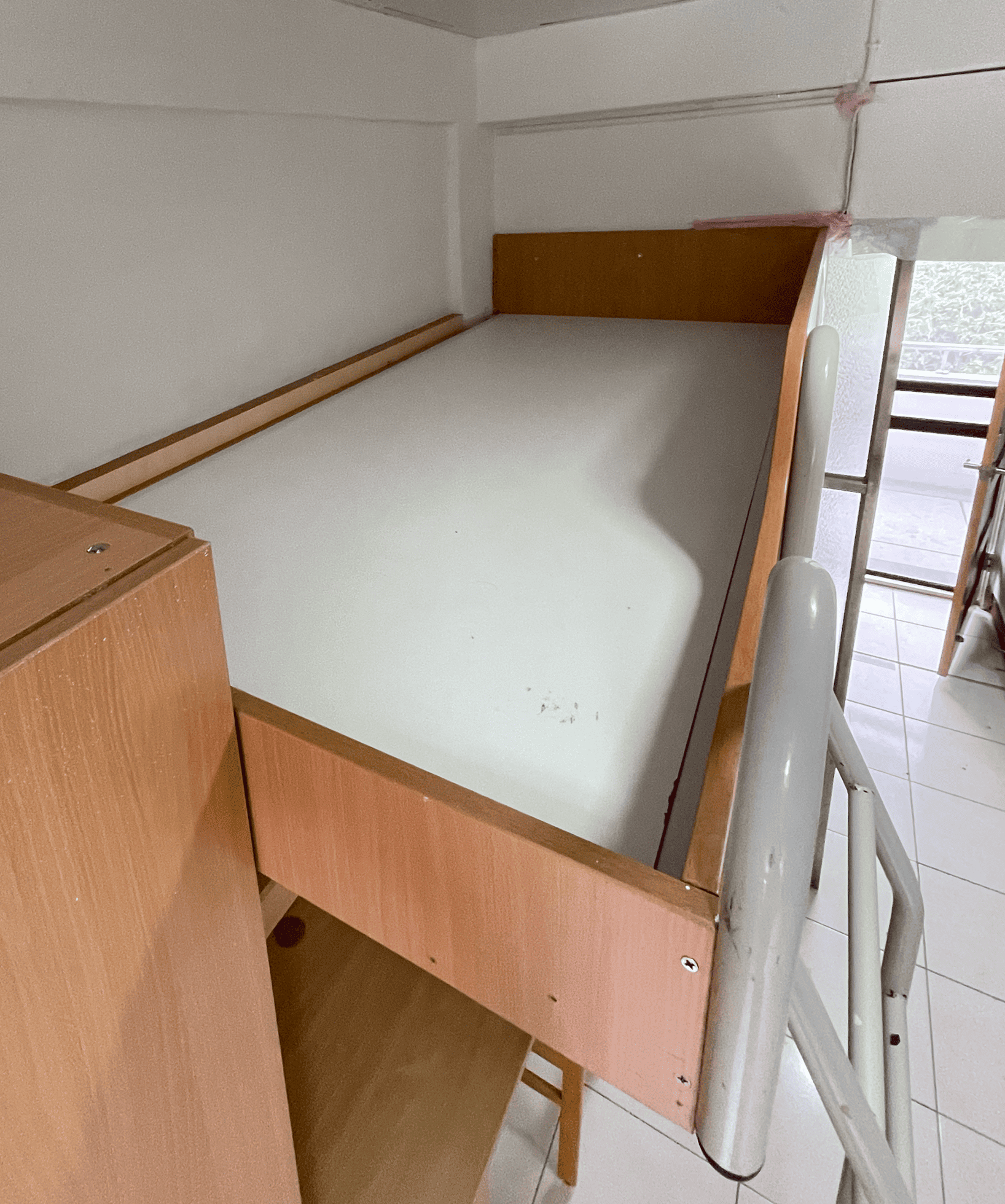寢室設備:床架(須自備床墊,尺寸為:187.5 CM*88 CM )、書桌椅、衣櫃、冷氣