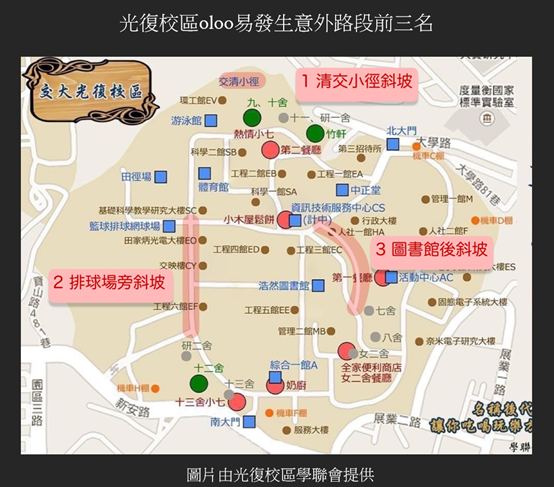 112-1意外事故分析,車禍佔30%,其中滑板車為第一名(43%),因此衛保組與電機系合作,拍攝oloo預防傷害防制影片及製作易發生路段地圖,期可減少交通事故預防傷害之發生率。