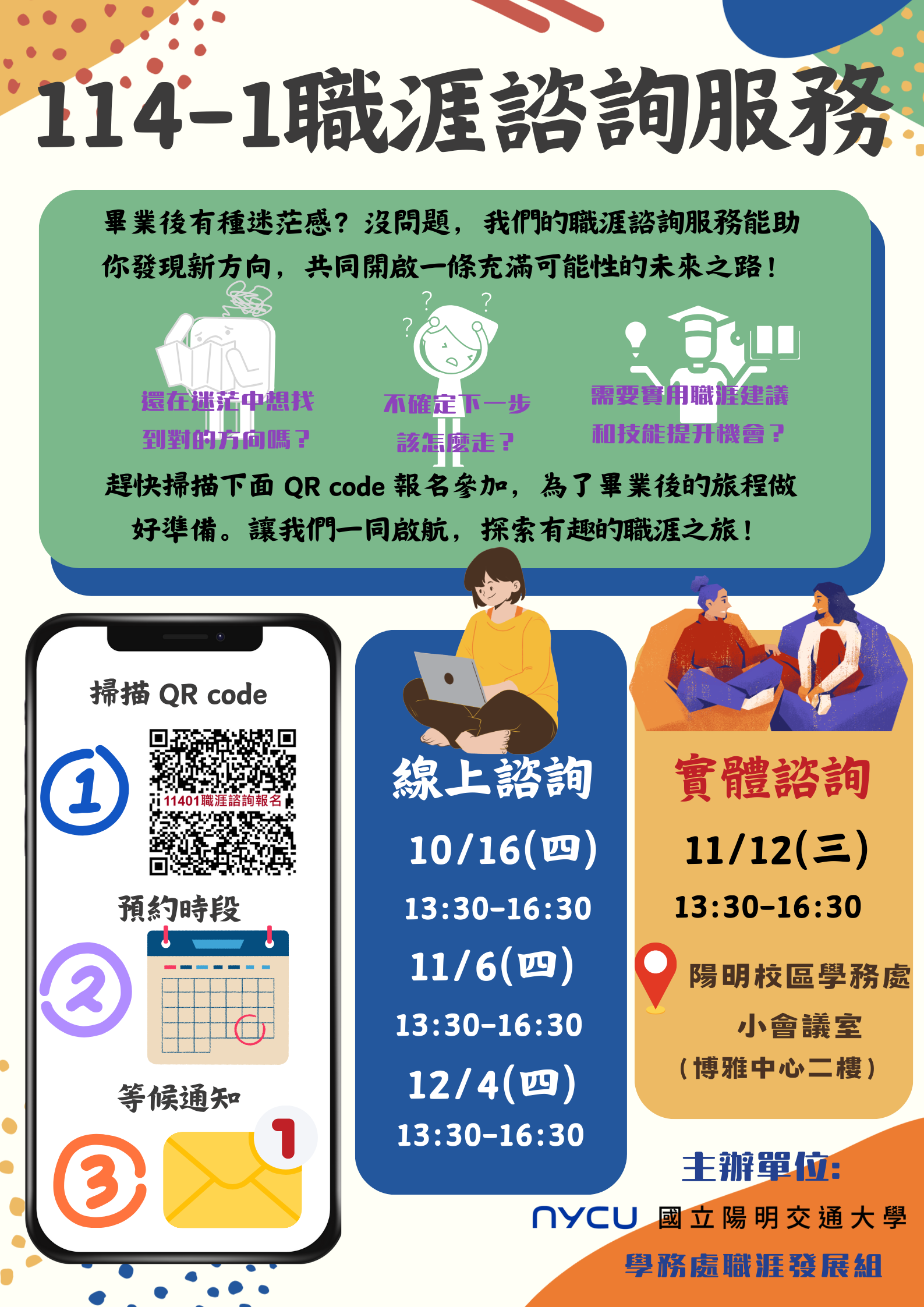 11401【職涯諮詢】一對一諮詢服務10/16(四)、11/6(四)、11/12(三)、12/4(四)開放報名,歡迎踴躍參加,額滿為止!